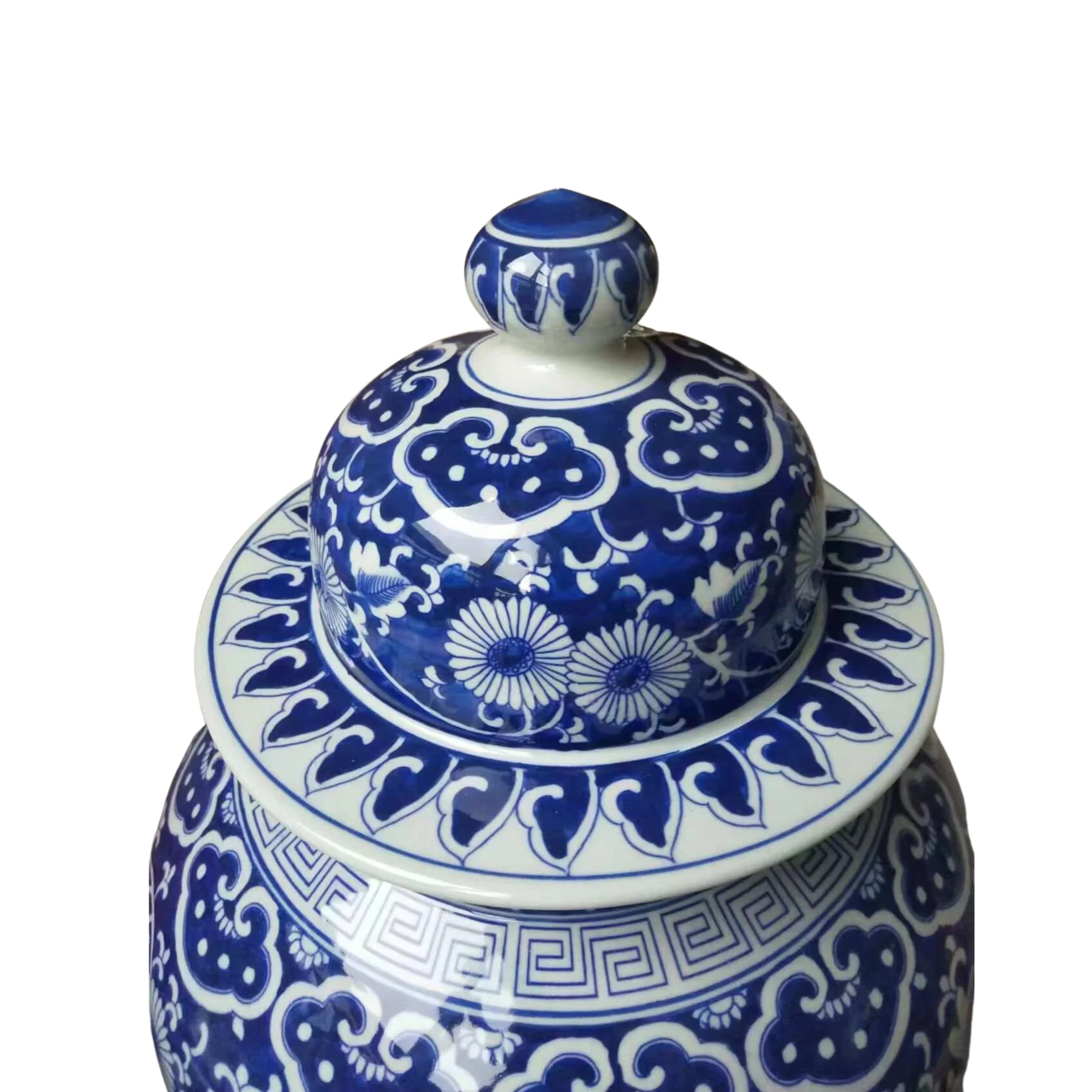 This intricately-designed, classic blue and white ginger jar features an exquisite dragon design. Our Chinoiserie Ginger Jars are expertly handcrafted in Jiangxi, China, known as the “Porcelain Capital” because it has been producing quality pottery for over 1700 years. Artists in Jiangxi continue to pioneer new techniques, blending old traditions with a modern aesthetic. Following a traditional process, they are hand-formed, dried, trimmed, painted and then fired in a kiln that reaches 1300 degrees Celsius.  They are then glazed and hand-painted.  23.5 inches (H) x 14 inches (D)Â