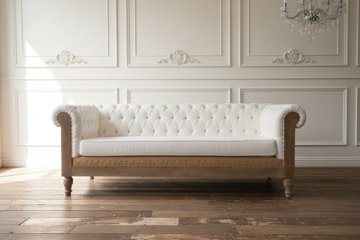 A sophisticated take on shabby chic, the Gauthier sofa is a vintage-inspired Chesterfield sofa with the exposed framework beautifully contrasting the "buttoned-up" upholstery, done in a crisp, organic hemp-linen.  An elegant take on a masculine style, it evokes a comfortable, time-worn piece in a Provencal manor house, brought to new life. Solid ash wood (responsibly sourced) with real, gorgeous linen and burlap upholstery.  84 inches (L) 38.2 inches (D) x 30.7 inches (H-back), 18 inches (H-seat)