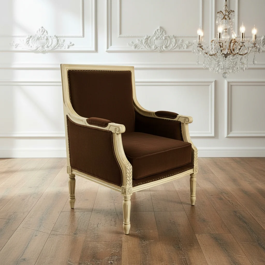 Upholstered in sumptuous fine velvet, the Luxembourg Armchair offers a luxurious seating experience while adding a touch of sophistication to any room. Its clean, graceful lines and richly detailed carvings make it a standout piece, blending seamlessly into both classic and modern interiors.